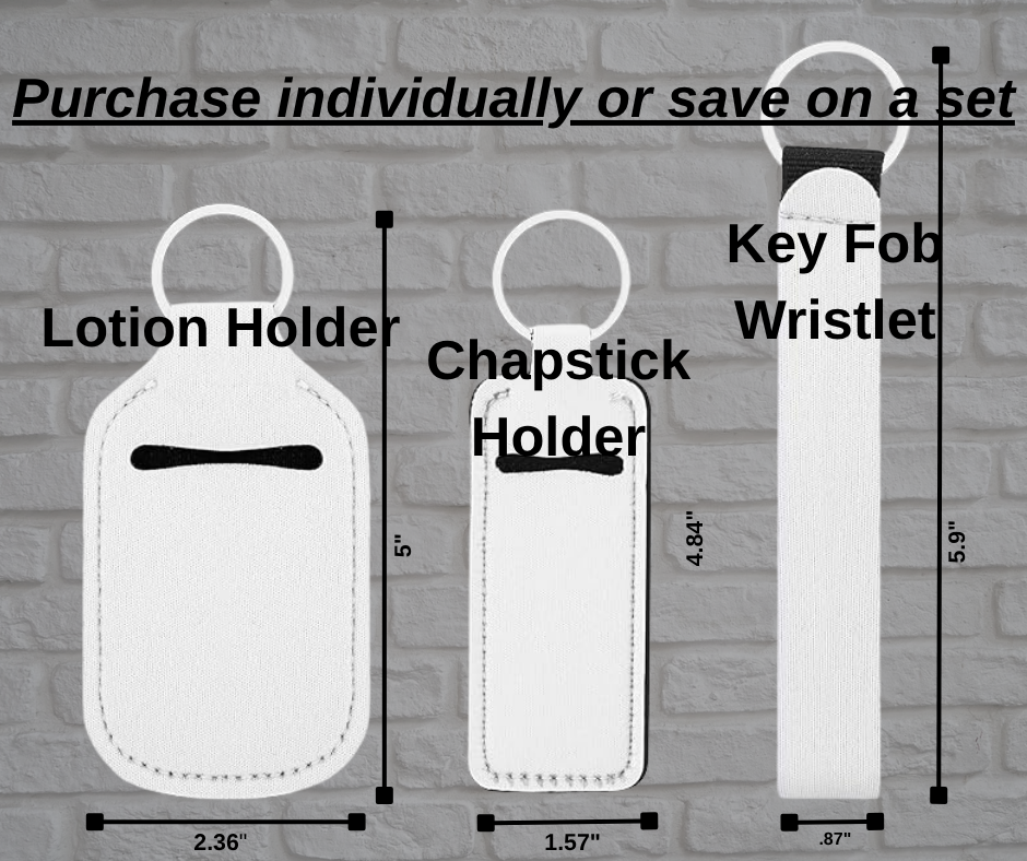 Set includes a wristlet keychain, ChapStick/lipstick holder with ChapStick (flavor varies), and a lotion/hand sanitizer holder (bottle comes empty for customer to fill).