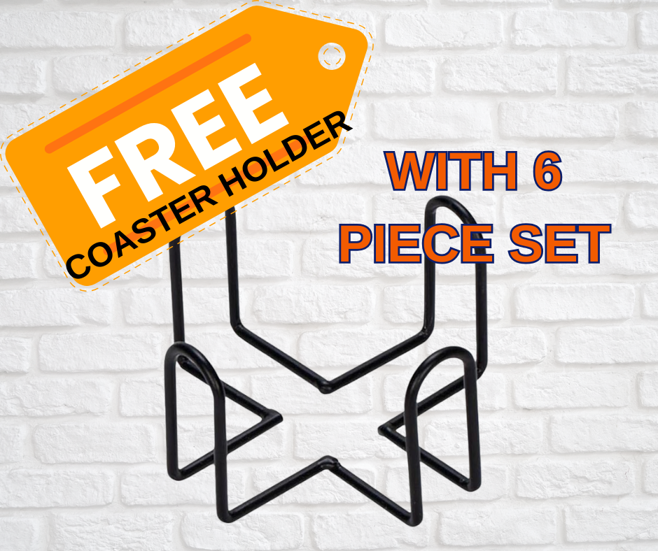 Our 4 inch ceramic coasters, perfect to protect your surfaces from your beverages. Whether it's the top of your desk at work or the side table at home, these thick ceramic coasters, with their cork bottoms, are a great way to protect your furniture from being scratched. Sold in singles or mix and match multiples for a discount. Makes a great small gift while also adding some fun designs to your tabletop. Purchase as a single or in multiples. 6 pack of coasters come with black, iron stand.